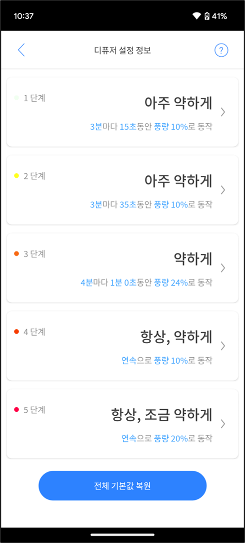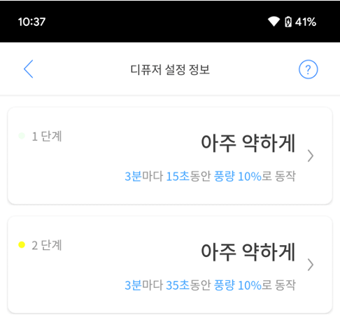 미로 스마트 디퓨저의 각 단계에 따라 설정이 어떻게 되는지 한 눈에 파악할 수 있습니다.