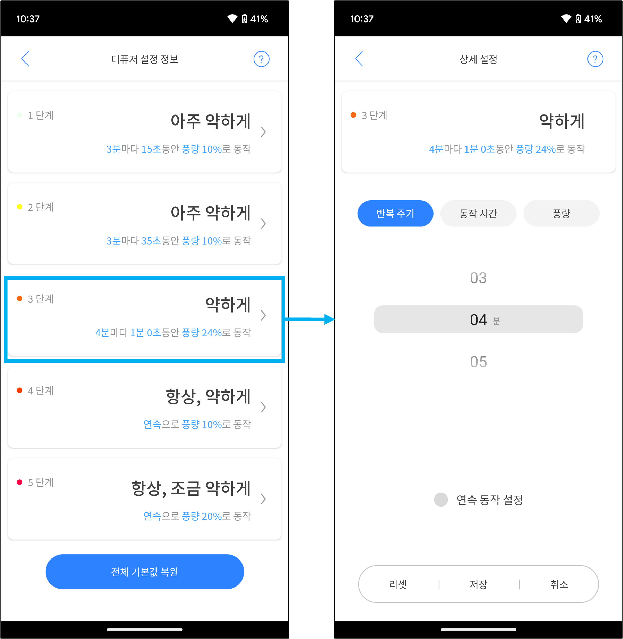 단계 설정 정보 목록의 각 단계에 해당하는 블럭을 터치하면 상세 설정 화면으로 진입할 수 있습니다.