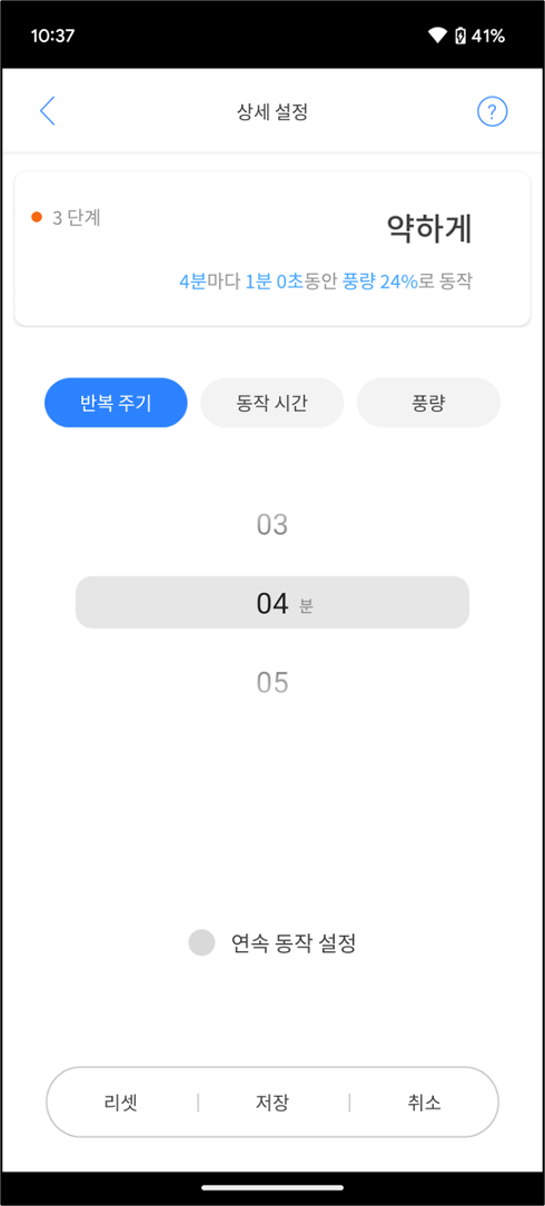 연속 동작 설정을 하면 꺼짐 시간 없이 계속 켜짐 상태로 동작합니다.